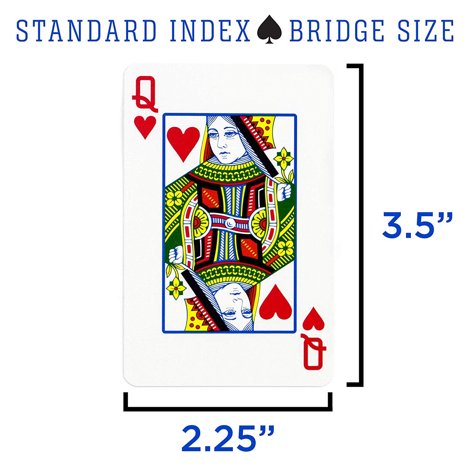 hese are two regulation-narrow size (bridge) decks that measure 2.25-by-3.5-inches (W x H), and are made of practically indestructible PVC plastic material for years of use. Completely washable via a quick wipe with a damp cloth, the cards won't soil over time. The decks come complete with a hard plastic storage and carrying case. Each deck includes 52 cards and 2 jokers.